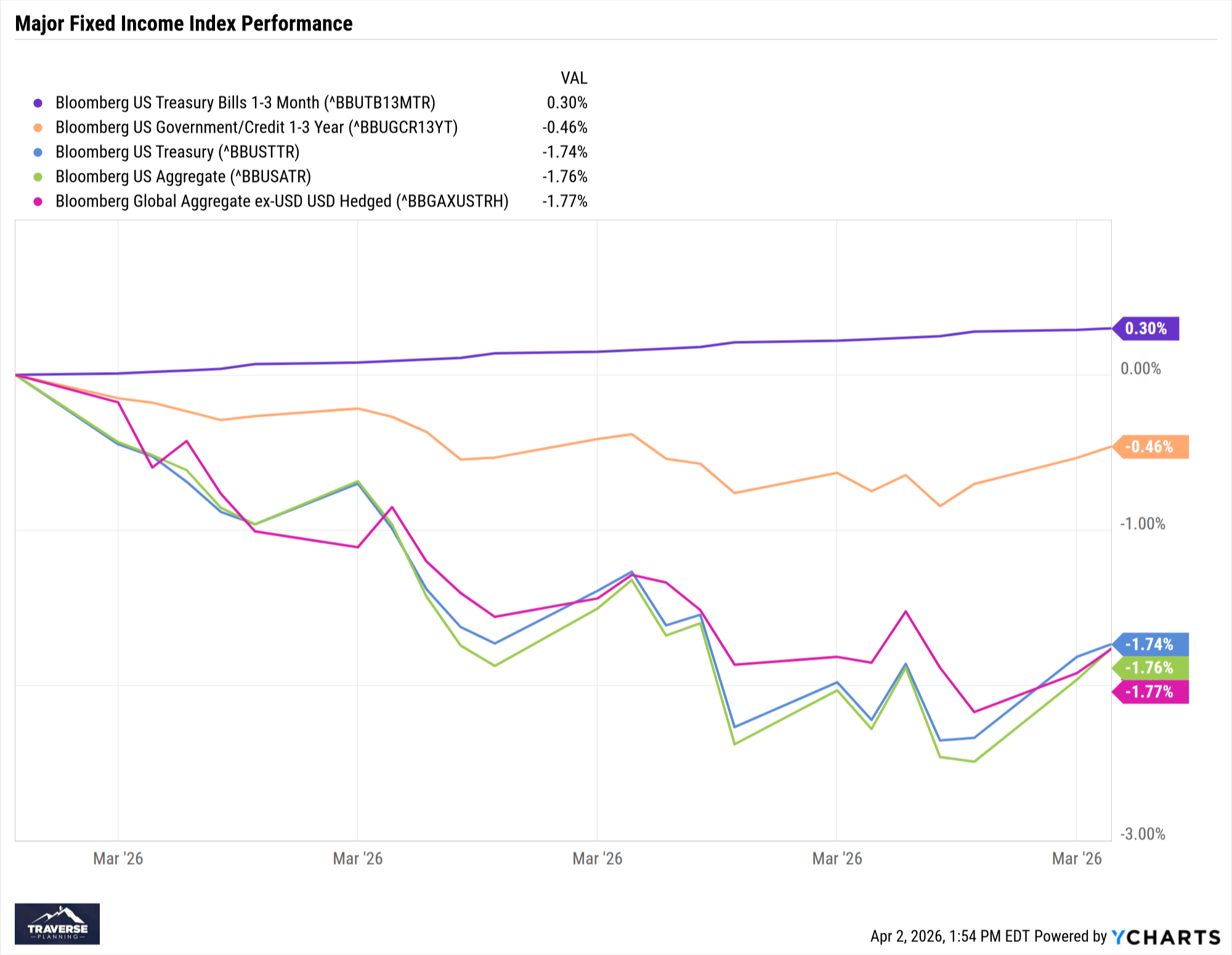 Overall, March represented a reversal from February’s bond rally, as geopolitical tensions, rising oil prices, and concerns around renewed inflation pressures pushed yields higher across the curve. Unlike February, when moderating economic data supported longer‑duration bonds, March’s environment favored short‑term exposures and defensive positioning. The month reinforced the importance of duration management and diversification within fixed income portfolios, particularly during periods when inflation and geopolitical risks reassert themselves.