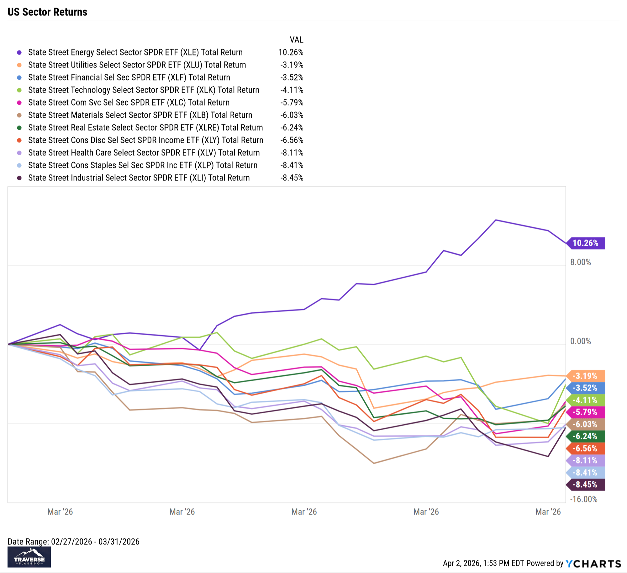 More economically sensitive and consumer‑linked sectors experienced the sharpest declines. Real Estate fell –6.24% as higher energy costs and interest rate uncertainty pressured financing assumptions, while Consumer Discretionary dropped –6.56% amid softer confidence and spending concerns. Health Care declined –8.11%, and traditionally defensive Consumer Staples fell –8.41%, suggesting that correlations rose meaningfully during March’s sell‑off. Industrials rounded out the month as the weakest performer, down –8.45%, reflecting heightened sensitivity to global trade, energy costs, and slowing growth expectations. Overall, March highlighted a narrow, energy‑driven pocket of strength amid broad sector weakness, underscoring the market’s heightened sensitivity to geopolitical risk and inflationary pressures.