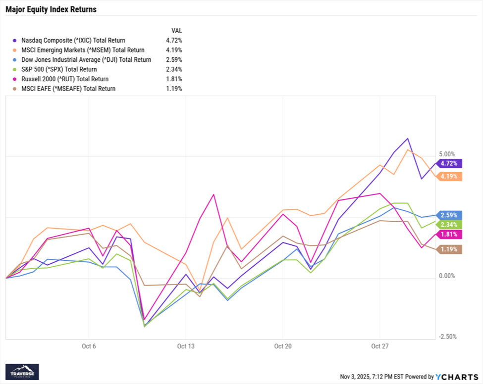 Smaller companies saw more modest gains, with the Russell 2000 up 1.8%, as investors weighed the benefits of lower rates against lingering concerns about growth. Developed International Markets (MSCI EAFE) trailed with a 1.2% return, as mixed economic signals from Europe tempered enthusiasm. Overall, October marked another strong month for equities, reinforcing confidence as markets head into year-end.