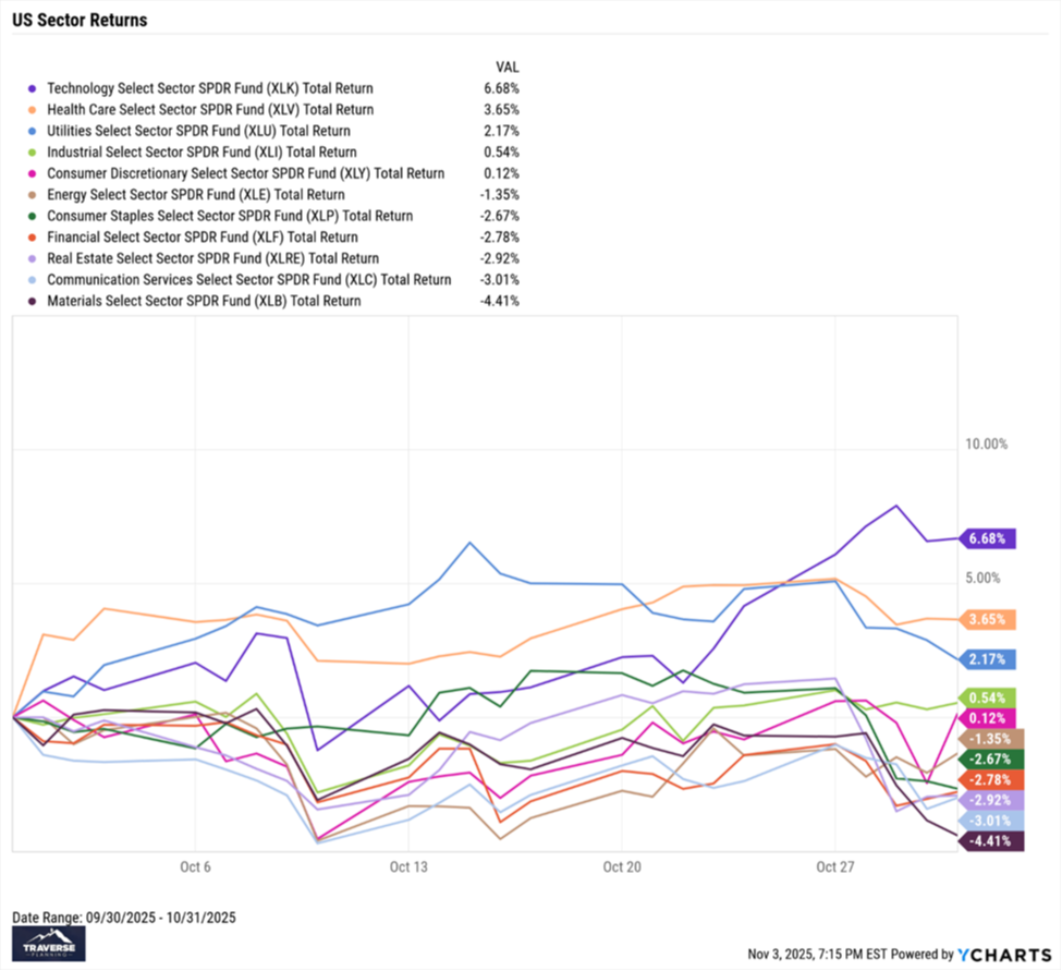 October saw mixed results across U.S. sectors, with five of the eleven posting positive returns. Technology once again led the way with a 6.7% gain, supported by strong earnings and continued optimism around AI-driven innovation. Health Care followed with a solid 3.7%, marking another month of recovery as investors rotated back into defensive sectors amid moderating inflation concerns. Utilities also posted a positive return of 2.2%, benefiting from lower interest rate expectations that eased pressure on dividend-paying stocks.