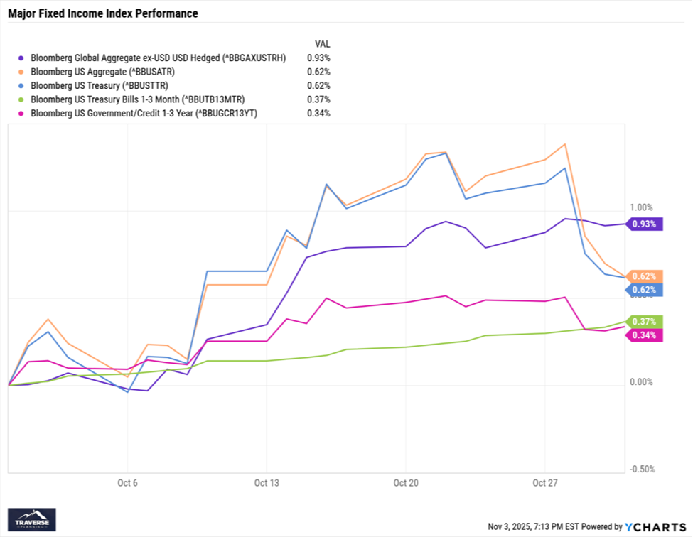 Bond markets posted modest gains in October, supported by continued expectations for lower interest rates and steady economic conditions. International bonds led the way, reflecting strength amid stabilizing global currencies and easing inflation abroad. U.S. intermediate-term bonds performed decently as investors maintained demand for high-quality fixed income during a period of monetary policy adjustment.