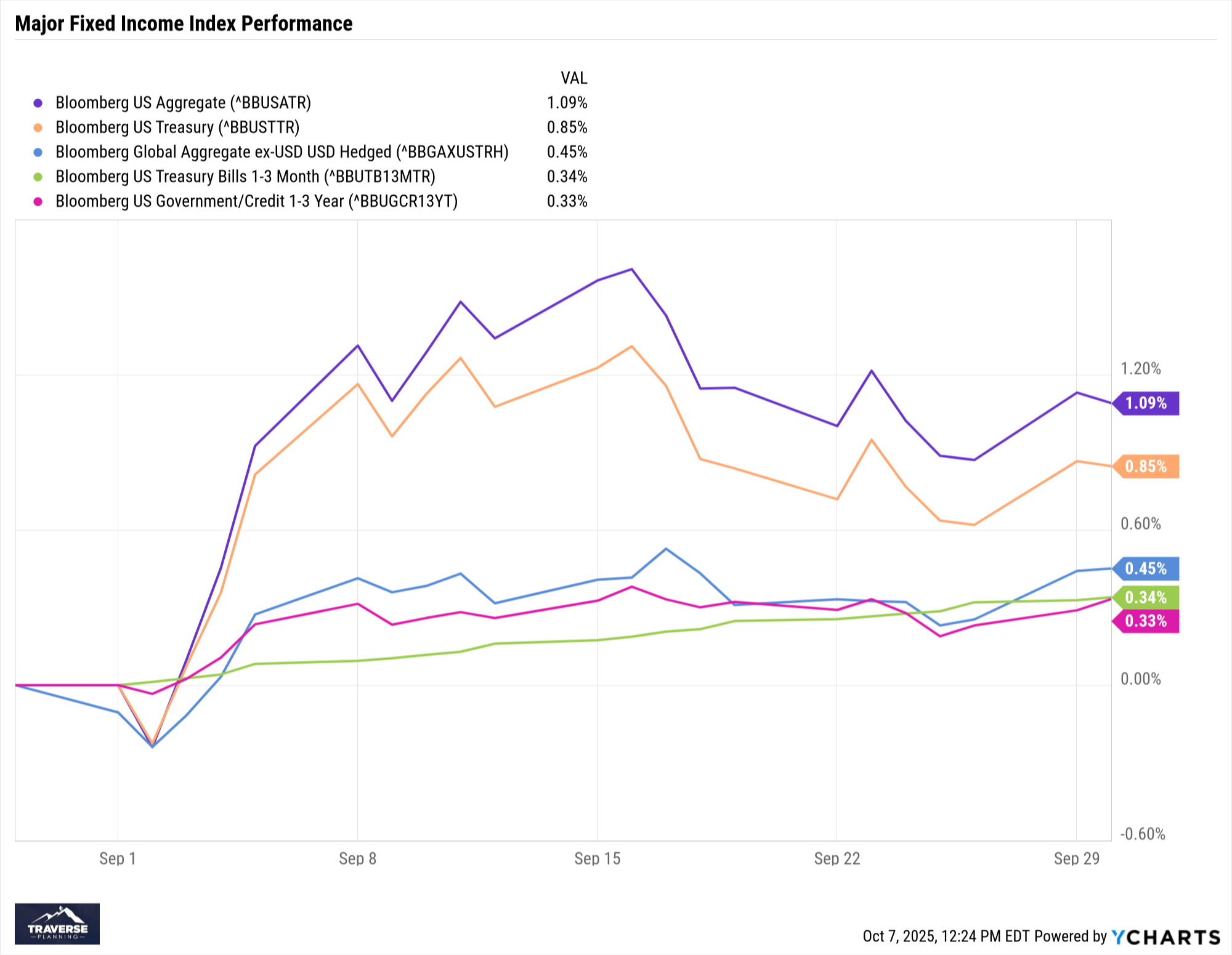 In September, bond markets posted modest gains across most major indices, largely driven by stabilizing interest rate expectations and steady economic data. Intermediate bonds performed well again in September after a strong showing in August supported by investor demand for safety amid lingering global uncertainty. Shorter-duration instruments like Treasury Bills and Government/Credit underperformed, as their limited sensitivity to rate movements offered less upside during the rally. Overall, September’s gains were modest but positive, signaling cautious optimism in fixed income markets.