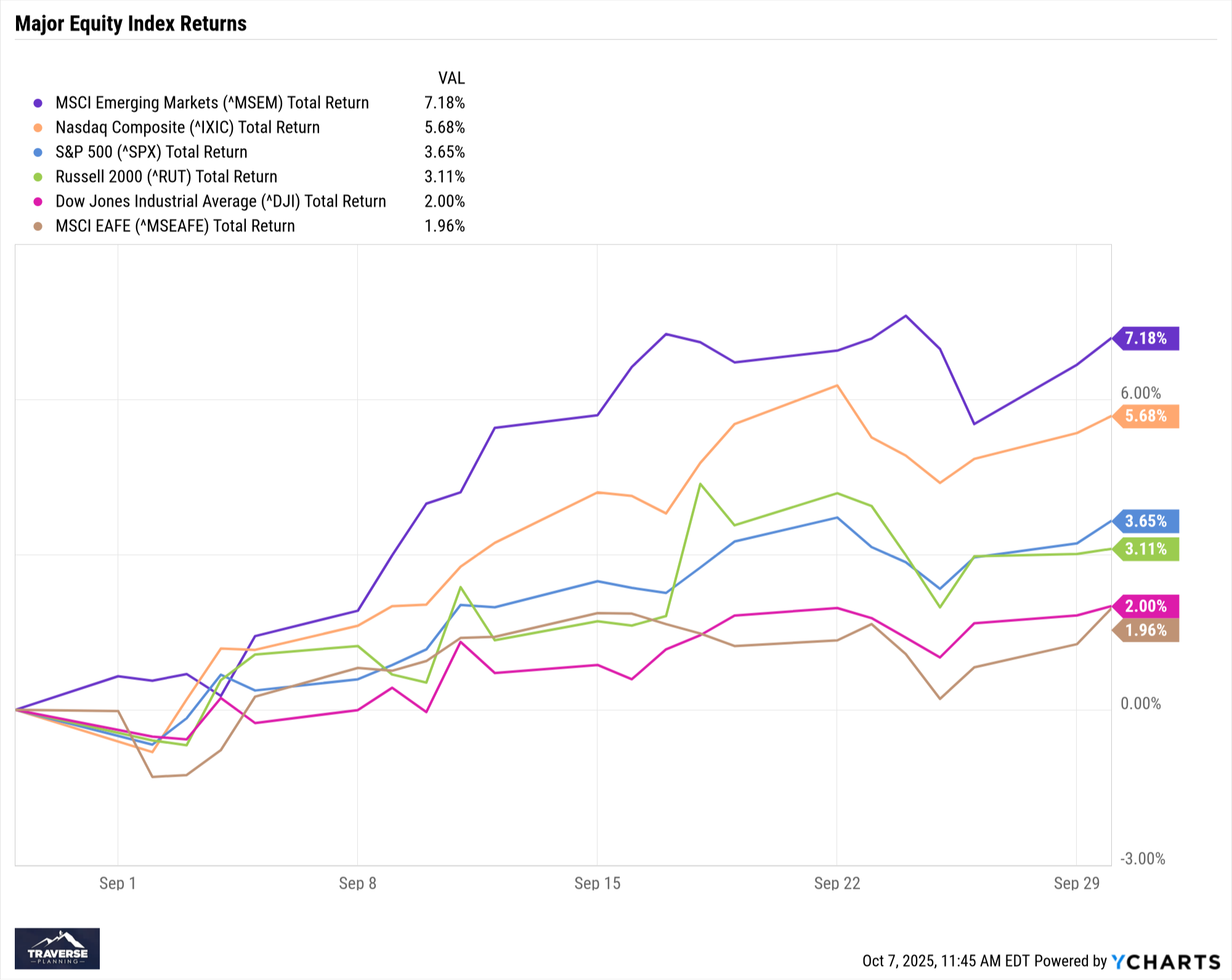 Even though the US government is currently shut down, for the rest of us, the world keeps on spinning as we continue going about our business. The same goes for the financial markets; they just keep plugging away. In this recap, we will discuss how the markets performed in September and then get into our topic of the month, our takeaways from our time at the two conferences Joel and I recently took time out of the office to attend. I’ve also decided to flip the script and cover that first, so let’s dive in.