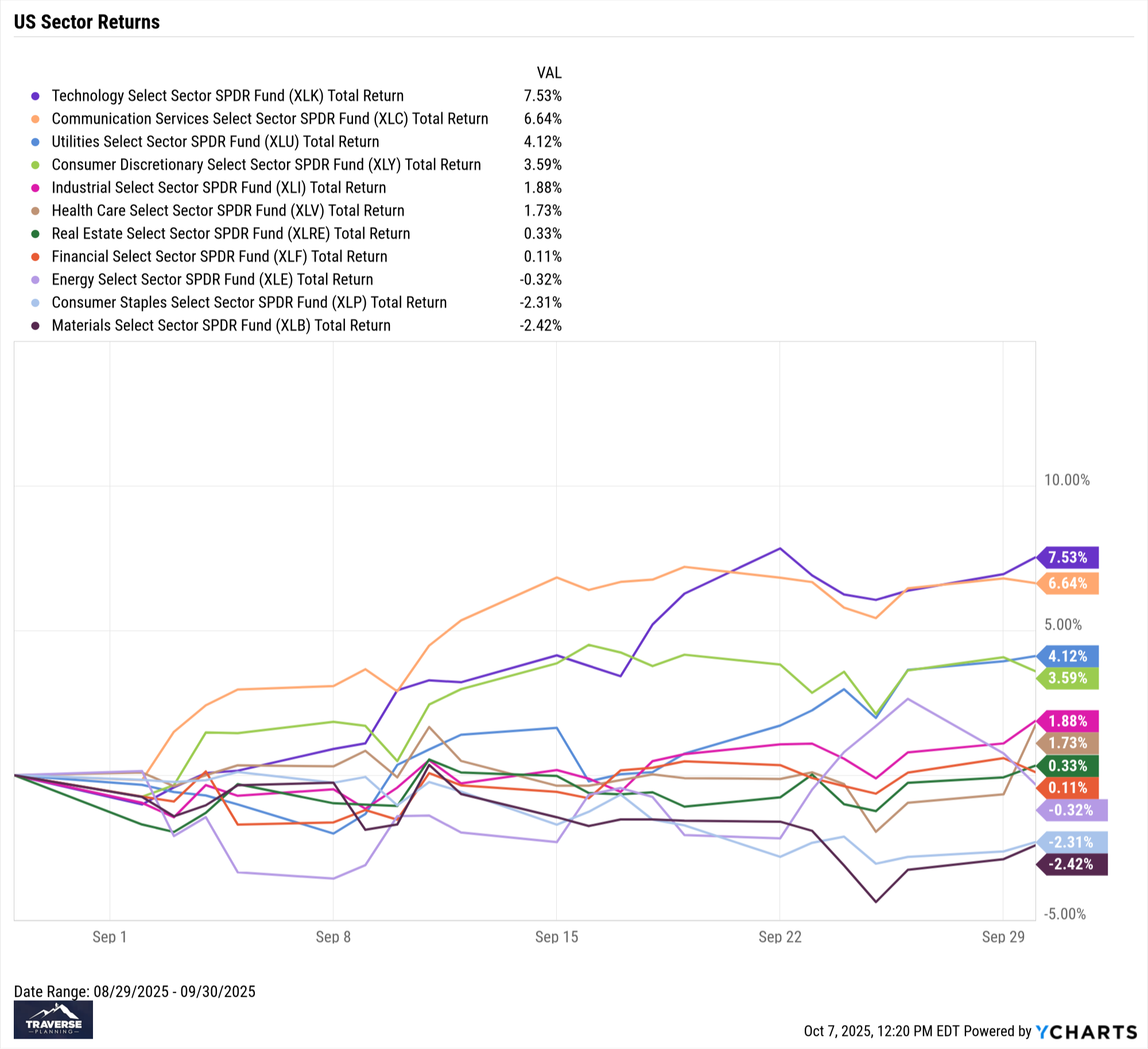 Turning back to look at US sector performance for the month, we saw eight out of the eleven sectors with positive gains. Technology (+7.53%) and Communication Services (+6.64%) led sector gains in September, which shouldn’t be a surprise based on the NASDAQ’s performance. Major announcements—such as Oracle’s massive AI infrastructure deal mentioned above and continued momentum from companies like Microsoft, Alphabet, and Meta—boosted confidence in these sectors. Additionally, robust earnings reports and upward revisions in growth forecasts for digital advertising and cloud services reinforced the narrative that these industries are central to the next wave of innovation, attracting significant capital inflows.